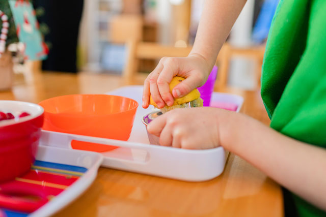 PRACTICAL LIFE Children learn lessons through real life activities such as spooning, pouring, and food preparation, which also help strengthen and train muscles necessary for writing.